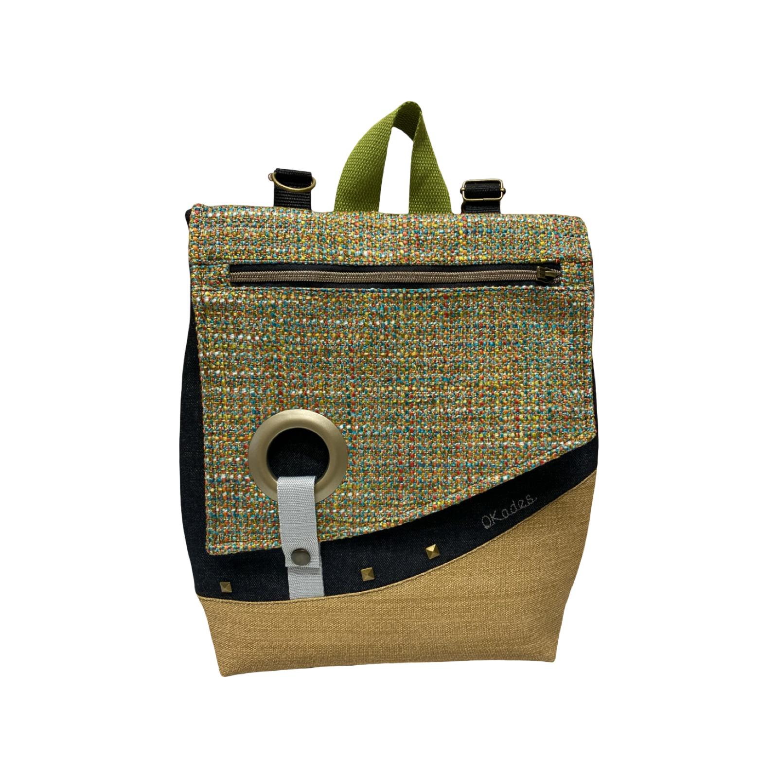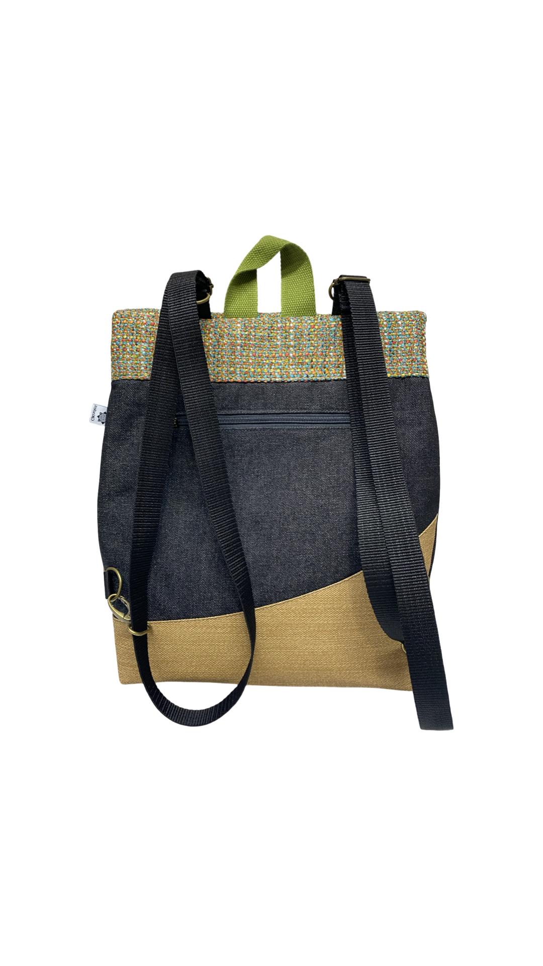 Mochila de tela, convertible en bolso o bandolera.