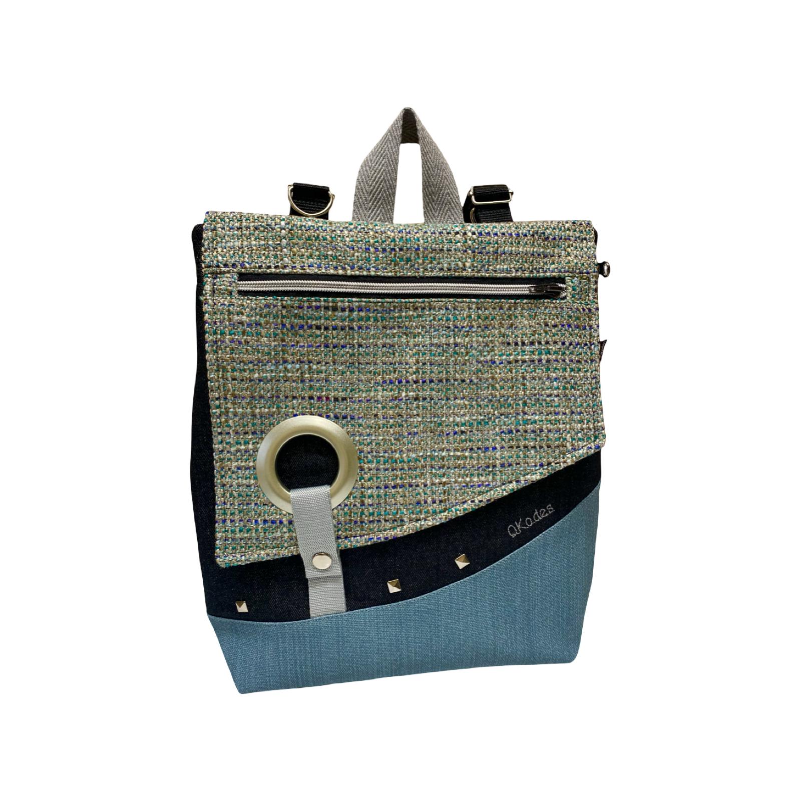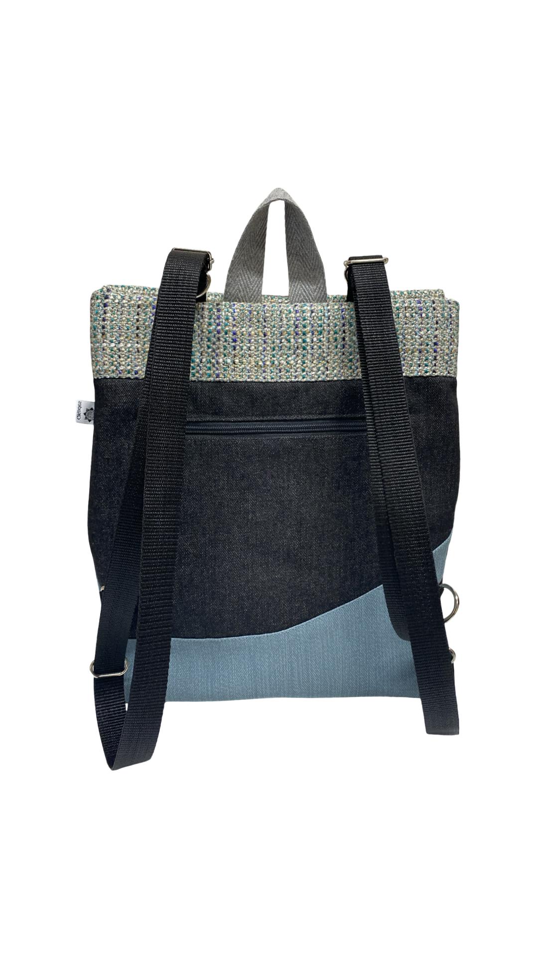 Mochila de tela, convertible en bolso o bandolera.