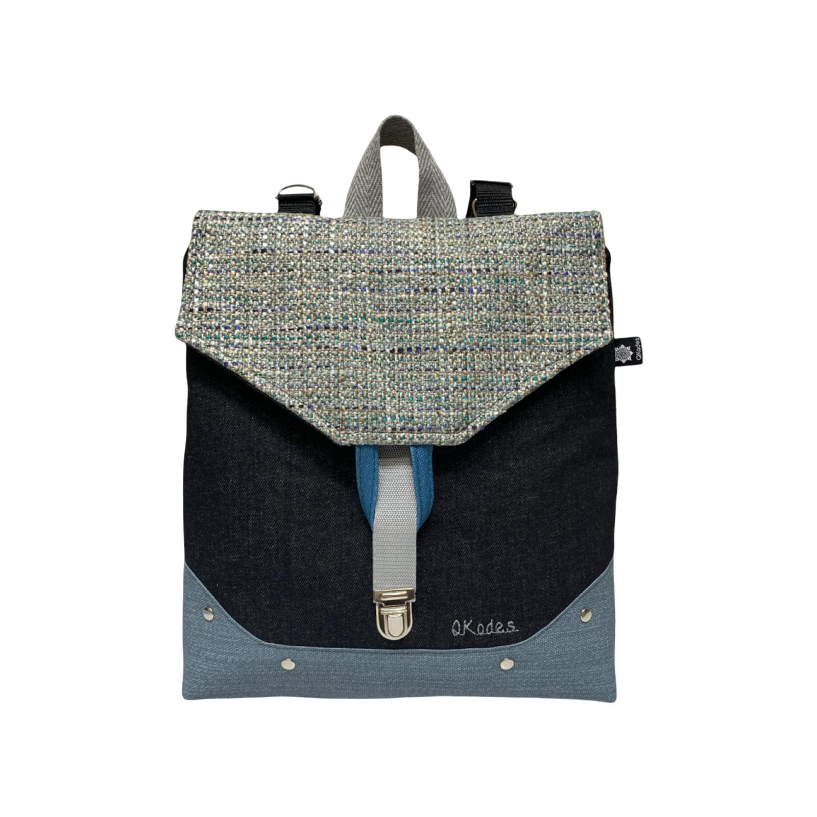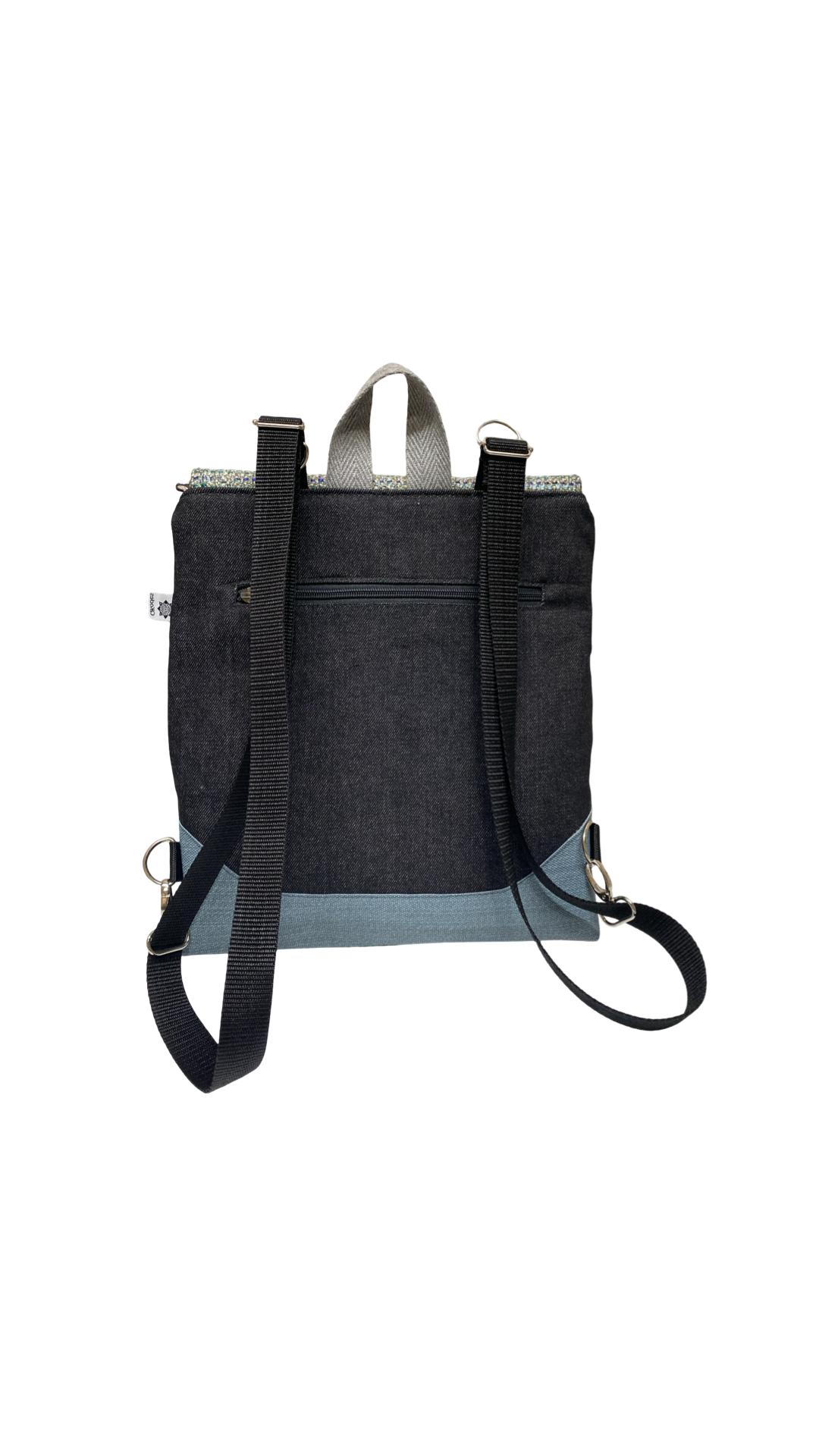 Mochila de tela, convertible en bolso o bandolera.