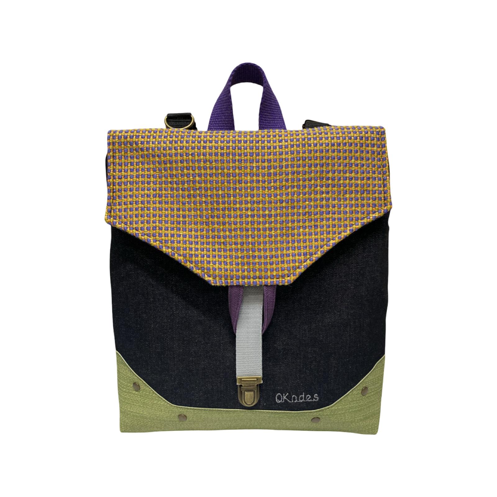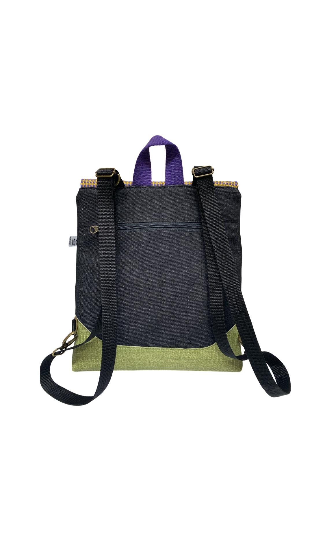 Mochila de tela, convertible en bolso o bandolera.