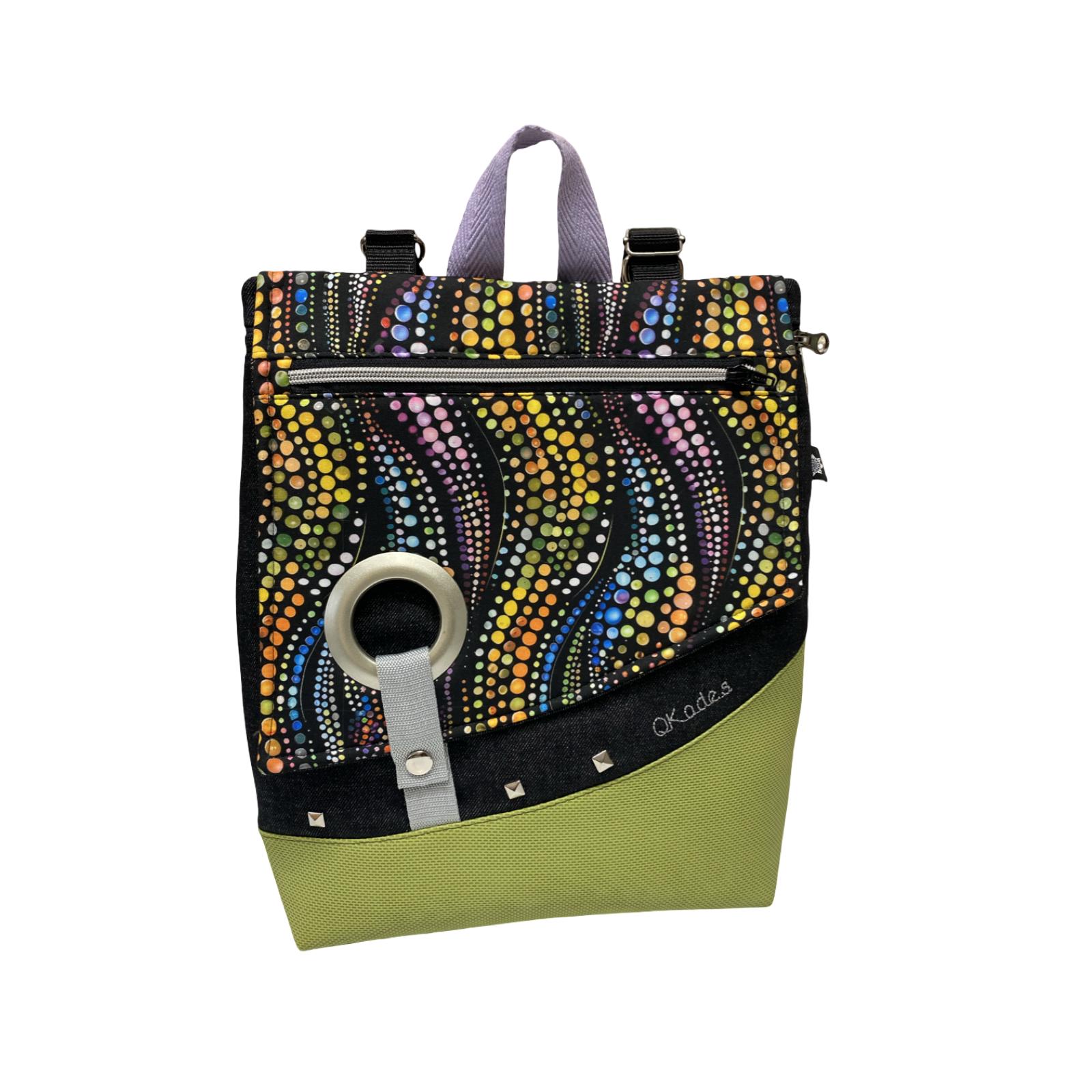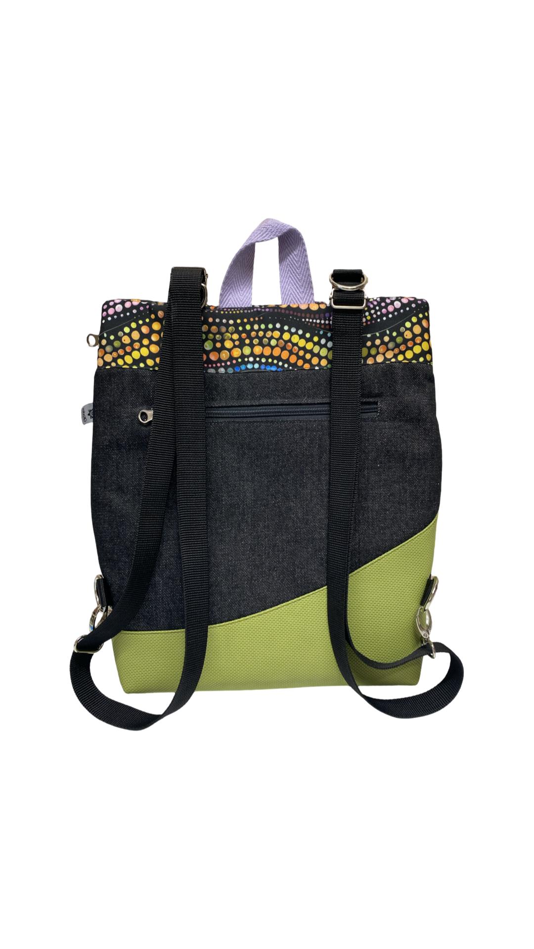 Mochila de tela, convertible en bolso o bandolera.