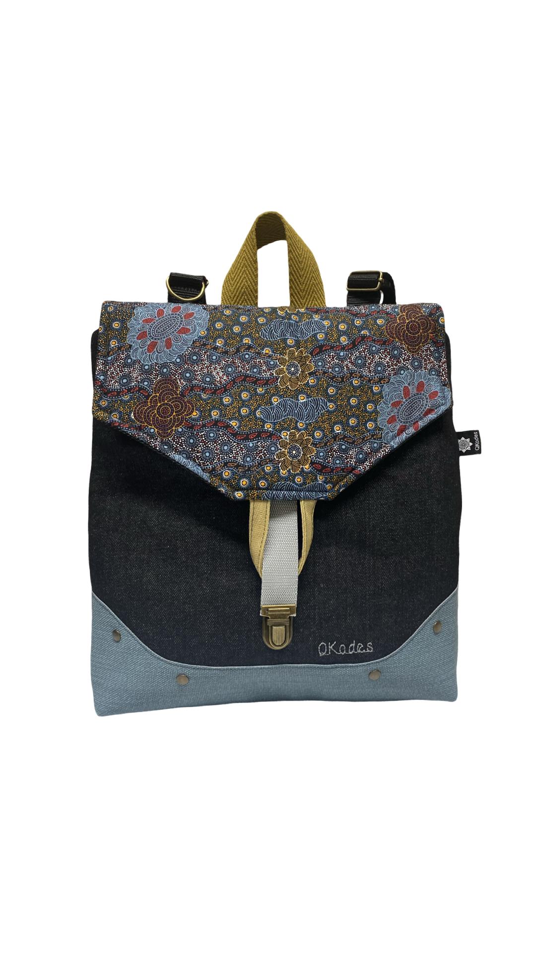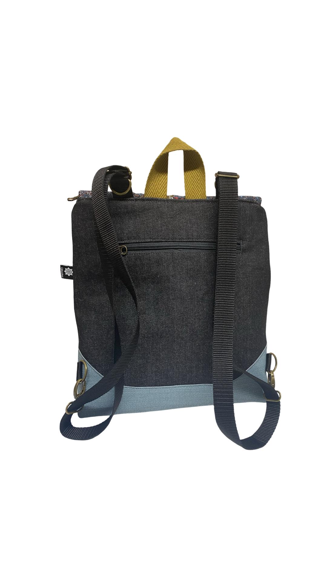 Mochila exclusiva hecha a mano, convertible en bolso o bandolera hecha de tela vaquera, tela de algodon y piel vegana.